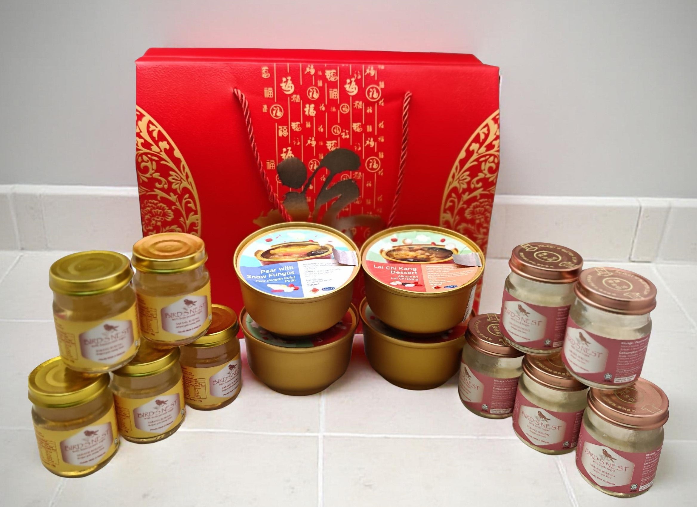 A festive pairing of handcrafted desserts and bird's nest drink, symbolising sweet beginingsm nourishment, and lasting good fortune. Thoughtfully prepared and packaged for CNY gifting.